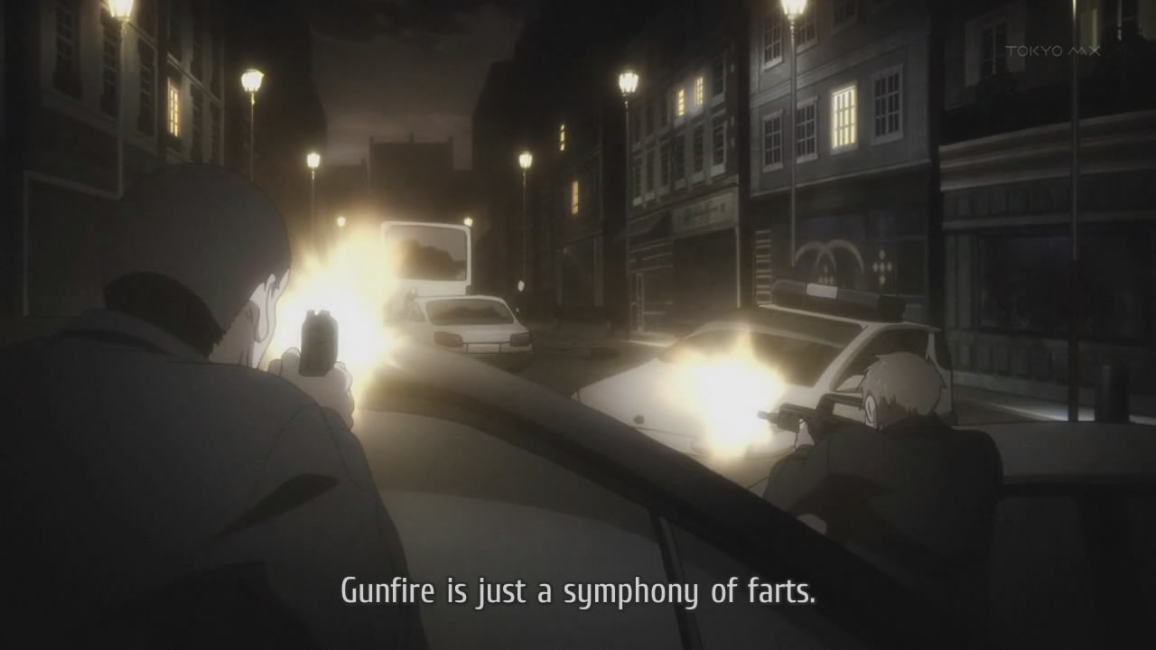 With Jormungand, you get episodes like the last one where you get lots of running animation and Koko outsmarting everyone. Then you get episodes like this one, where the comical bad guys shoot lots of boolets and hit everybody except the main characters. Is it supposed to be philosophical, about the duality of human nature? About the reality of the arms trade? About economics? Gunplay? Gratuitous lesbianism? Nobody is really sure. Likewise, the quality of this show waffles from serviceable to downright atrocious.