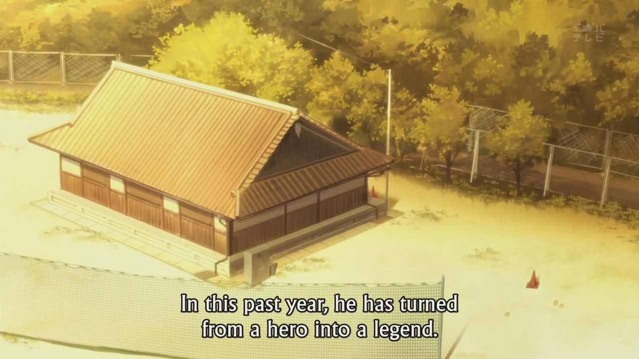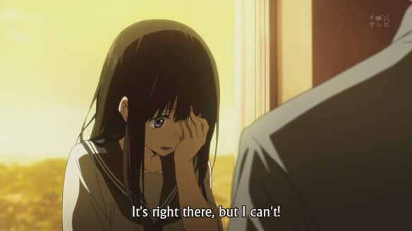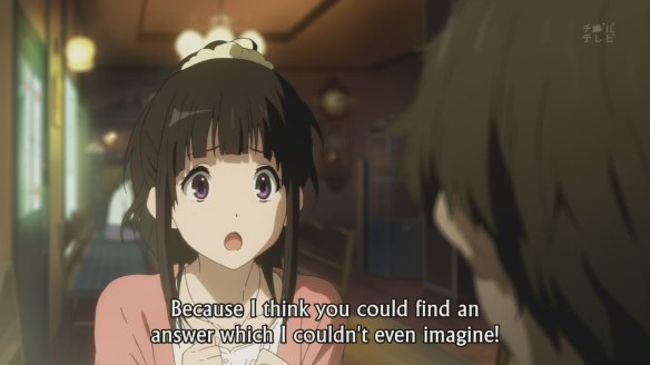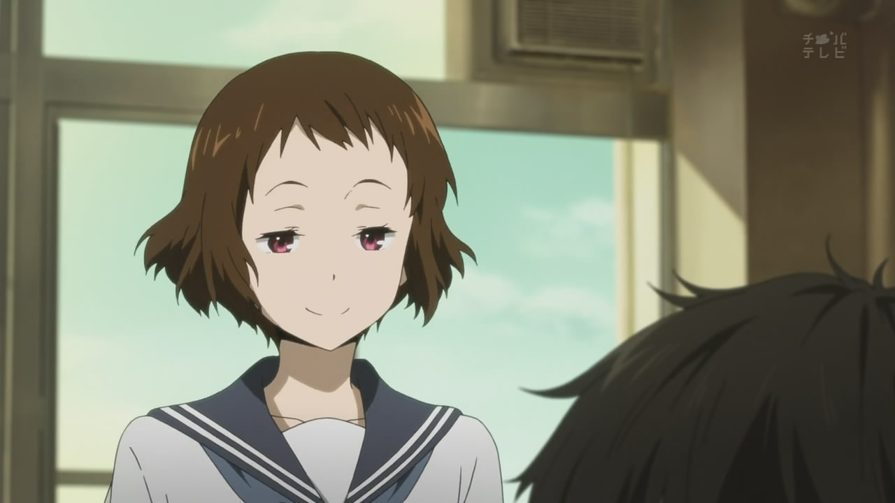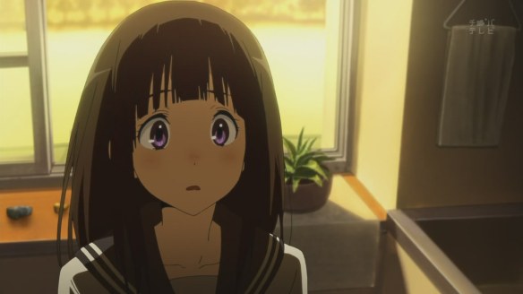 The slice-of-life…-iness is also very present in this series, which is one of the reasons why I’m rather fond of it, I suppose. The slow scenes, with the camera lingering on a single shot for maybe a dozen seconds before moving on to the next still shot, really helps to convey a sense of the slow passage of time. It allows us to feel closer to the characters as well, and focus more on their expressions and feelings. Since the central mystery is dealing with the past (and all the feelings of nostalgia that it inevitably comes with), such a slow pace actually compliments the plot. I know a major complaint from some viewers (one of which shall remain unnamed) is that “nothing of importance happens in this show”. To which I’ll say: this show is much more about the characters and their interactions with one another, and their growth. It’s unlike K-On! or Lucky Star and other shows of their ilk, in that it doesn’t take every opportunity to make a cheap joke. Case in point: the magnificent Satoshi walks into the clubroom dresses as a sunflower, right after Ibara accuses Houtarou of being weird. However, this visual joke is not remarked upon after this, with the show moving on in favour of more serious developments (i.e. the missing volume). I suspect that in most other shows, the joke would be milked for all that it’s worth, thus killing any humour present in the first place.