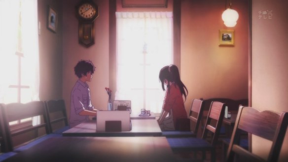Once again, this show moves on at a snail’s pace, leaving no detail undetailed and no mystery unsolved. However, this attention to detail, and the little things that Kyoto Animation adds to the show, are precisely what makes it so enjoyable. Take the opening scene: at the end of episode 2, Chitanda takes Houtarou to a cafe. She’s visibly nervous, and seems about to ask Houtarou something, and the episode ends. The viewer is naturally assuming that the question has something to do with romantic intentions; the opening of episode 3 seems to indicate that Houtarou assumed the same thing. Prior to Chitanda revealing that the question pertains to a favour, the scene is shown with a rosy hue, and the pendulum on the wall-mounted clock is heart-shaped (which even skips a beat/tick just prior to Chitanda’s revelation, furthering the visual metaphor). In the scene, Chitanda is also much more subdued than her normal, continuously curious self. Maybe nervous/shy Chitanda is her real personality? Who knows, but I’ll bet we’ll be seeing more of it in future episodes.