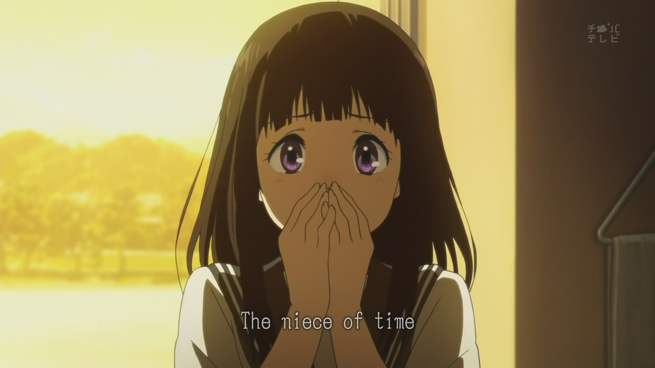Another thing: Chitanda’s uncle supposedly went missing in India, and Houtarou’s sister was also in India when she sent him the letter asking him to join the Classics Club. Could his sister also be searching for the mystery? I don’t think her being in India could have just been a coincidence. His sister’s VA also voiced Kaname Chidori from Full Metal Panic!, two seasons of which were produced by Kyoto Animation. Is this also a coincidence? Could there be a crossover forthcoming? Perhaps! Damn, I’m so curious.