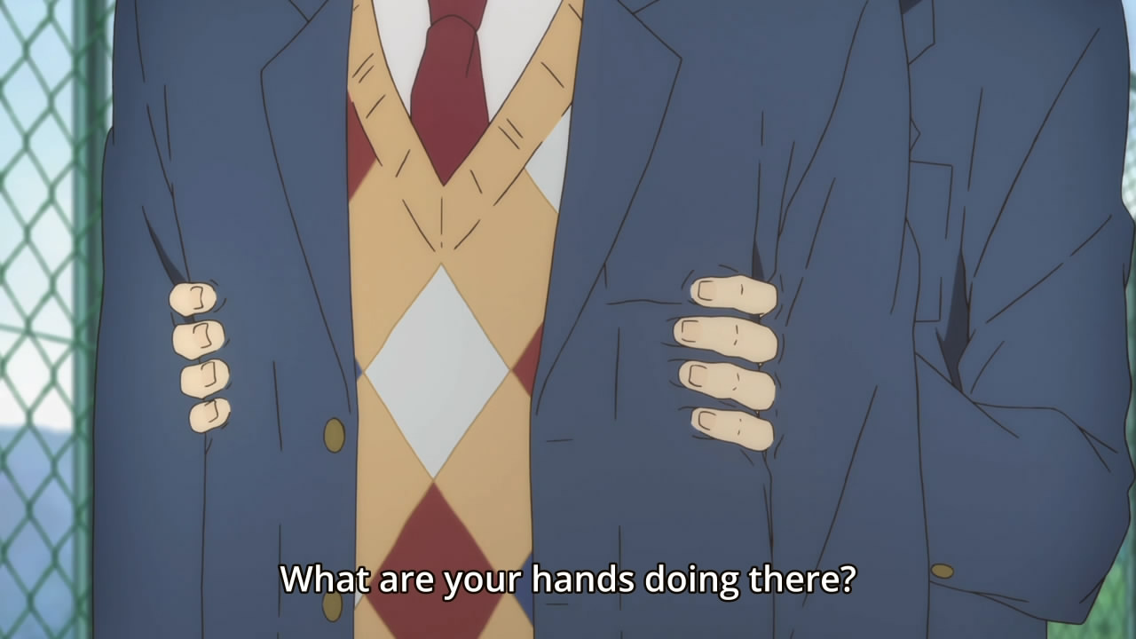 This episode contained enough foreshadowing to drown a small litter of kittens. We start out with Aki-chan standing in a field with a (presumably) dead body at his feet, doing his best silent Lady Macbeth impression. Hiromi, Chitanda/Mio/Mitsuki’s brother, finally makes an appearance, although he doesn’t do anything other than prattle on mysteriously about…things (HorribleSubs really is quite horrible, I feel like I missed most of the subtext in that scene). Oh, and he talks about his feelings.